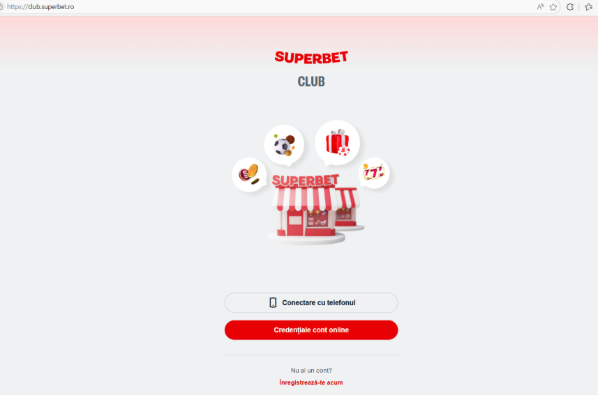 Pentru logarea/înregistrarea de pe telefon, se accesează club.superbet.ro și se selectează opțiunea "Înregistrează-te” (pentru clienți noi) sau „Intră în cont", după care se selectează opțiunea „Înregistrare folosind credențialele online".